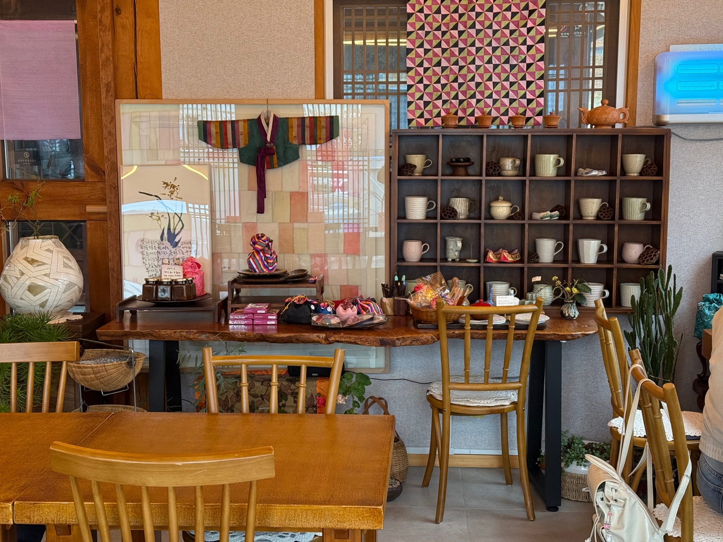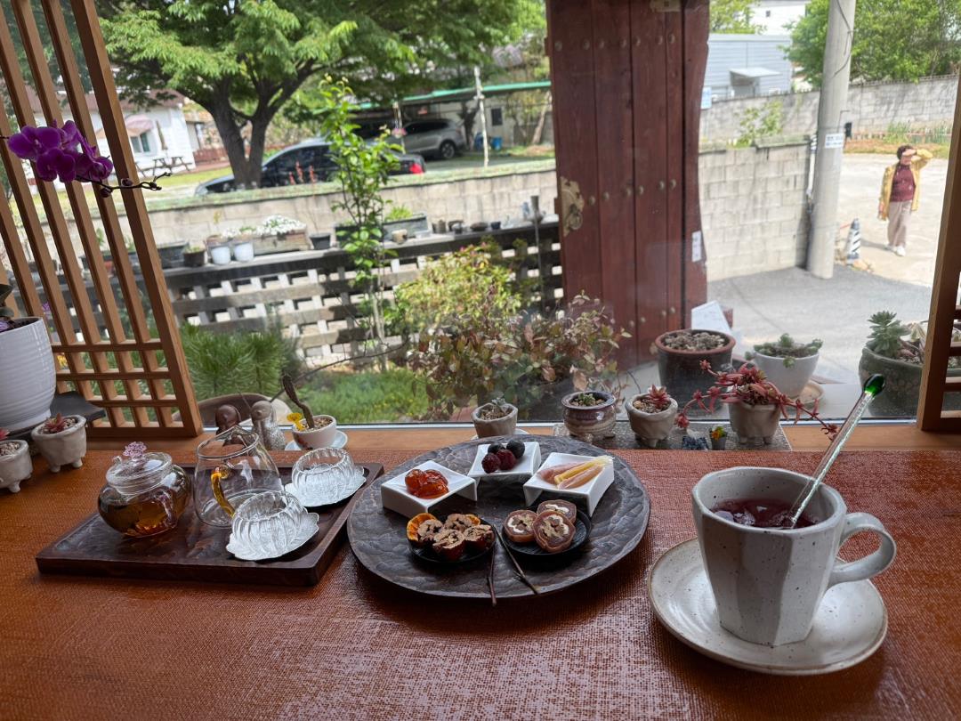 공간 곳곳에는 다육이와 정성껏 관리된 화분들이 어우러져 자연스러운 따뜻함을 전달합니다. 창 너머로 펼쳐지는 소박한 정원은 이곳을 단순한 카페가 아닌, 하루를 쉬어갈 수 있는 휴식처로 만들어줍니다. 한옥의 구조에서 오는 차분한 기운과 포근한 인테리어는 이곳에 오는 이들에게 안정감을 주는 느낌을 선사합니다.