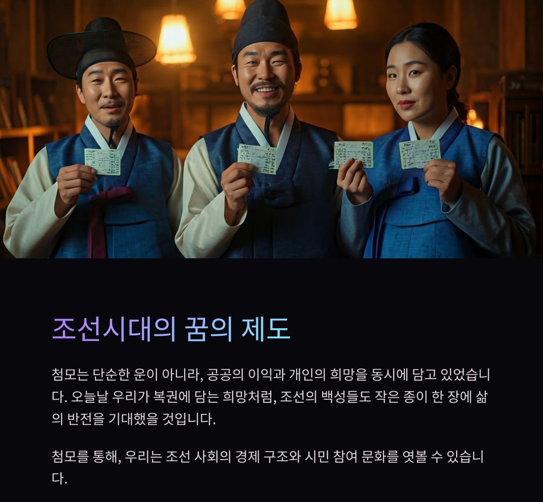 첨모는 조선시대 국민과 국가가 함께 만든 ‘꿈의 제도’였습니다. 단순한 운이 아니라, 공공의 이익과 개인의 희망을 동시에 담고 있었죠.