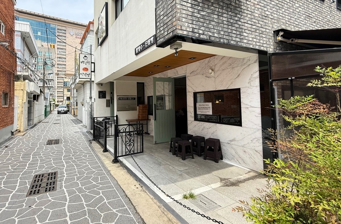 주변은 조용한 주택가와 오래된 상점들이 어우러져 있는 풍경인데, 백팥집의 외관 역시 그 풍경에 자연스럽게 스며들어 있습니다.